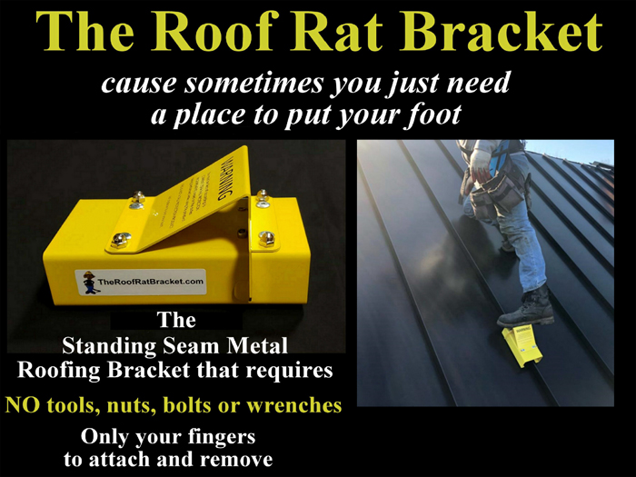 The RoofRat™ Bracket is a roofing bracket that quickly and securely locks onto the vertical seams of standing seam metal roofing panels—without tools—to create a handy place for roofers or building maintenance people to put their foot while working. For more information, visit theroofratbracket.com.
