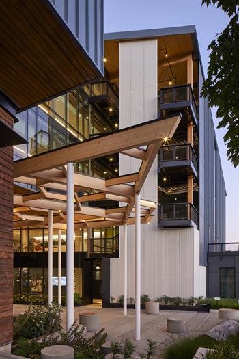 Constructed to be a neighborhood-focused workplace and retail center, 35 Stone is a showcase for Seattle’s Living Building Pilot Program, celebrating Seattle’s origins with its mass timber framework and an industrial inspired form, including