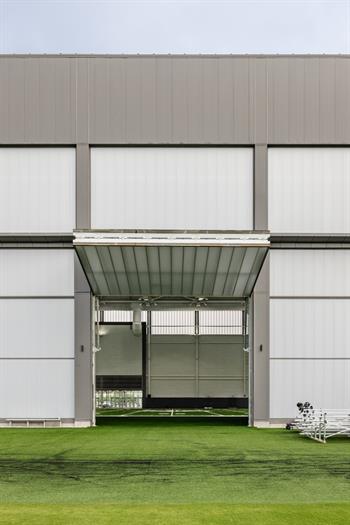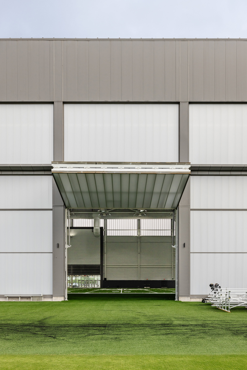 “It’s all about speed and efficiency, migrating between the outside practice fields and the inside practice fields,” Valka says. “The door basically creates a nice funnel for the transition between inside and outside.”