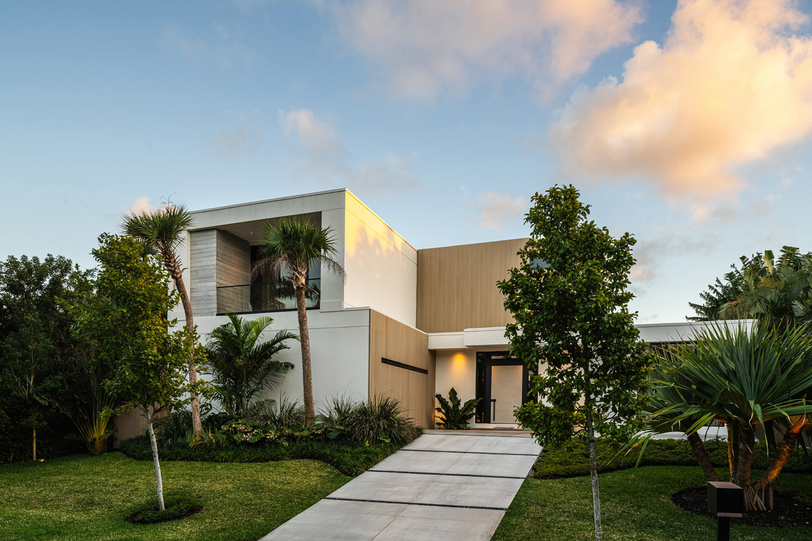 The door is covered with a stylish blond composite wood cladding to match the design exterior aesthetic of the rest of the house. Mirna describes the house as having a very organic and tropical look with a mid-century touch, built with high-end materials