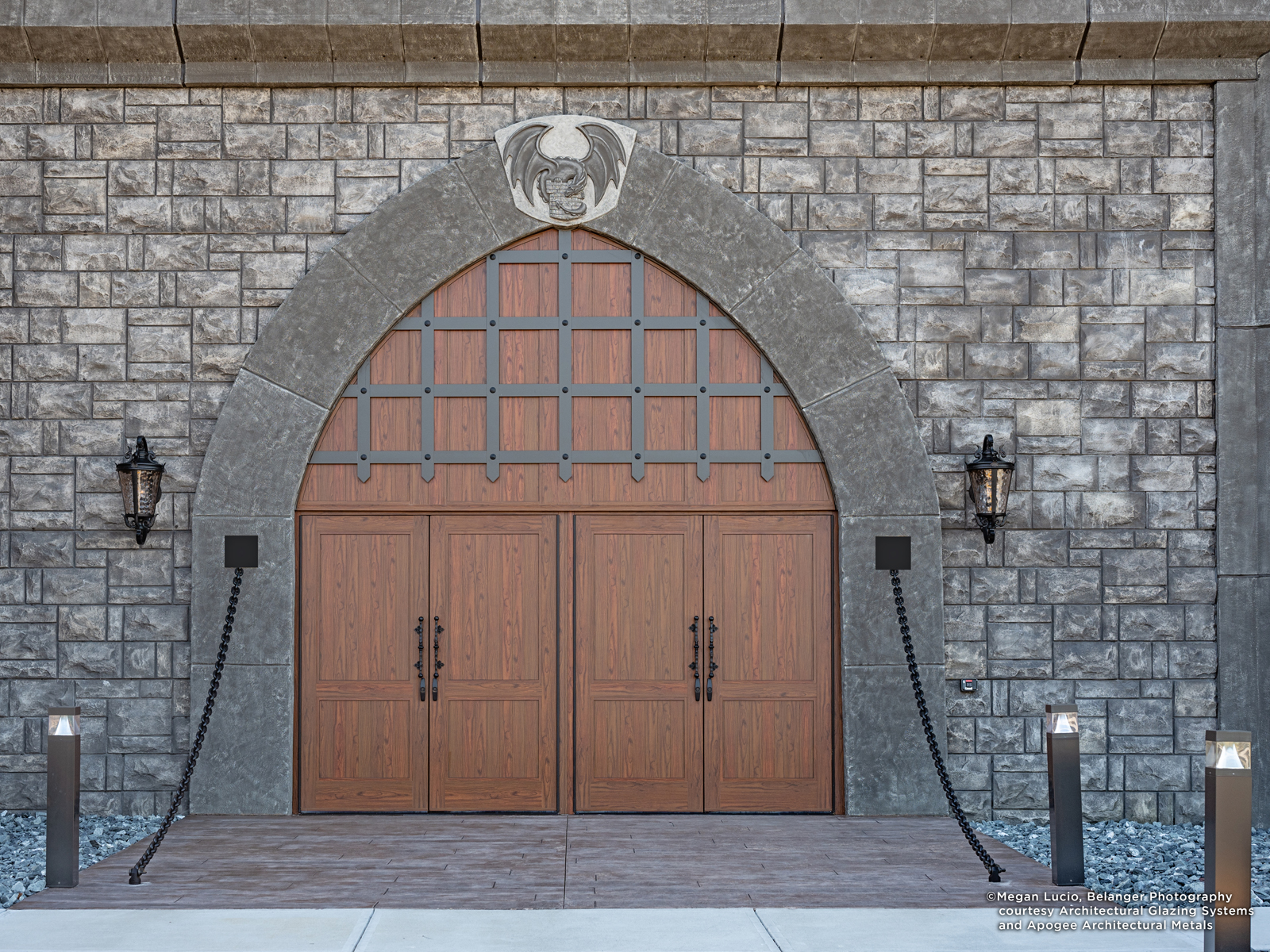 the AGS team custom-designed, engineered and manufactured Silver Stone Castle’s enticing entrance as a four-leaf, wood-look doorway with oversized hardware. Above the doors is a large, curved section that appears to be solid wood. Onto this transom