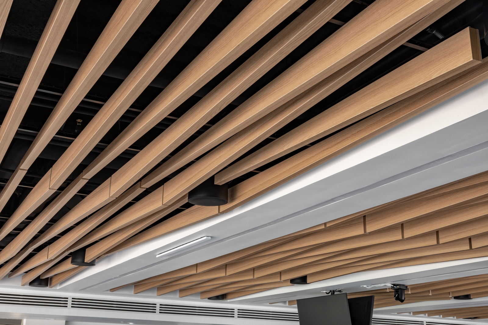 with the black T-bar system and ceiling, fitting in between the ceiling panels to maintain its visual appeal while remaining flexible to the needs of the space. The ability to meet design requirements while not sacrificing aesthetics is a key element